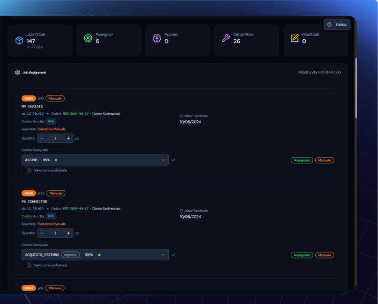 Lo schedulatore sceglie tra il centro di lavoro più efficiente considerando saturazione, costo orario e setup corrente. Risultato: meno cambi utensile, più ore produttive.